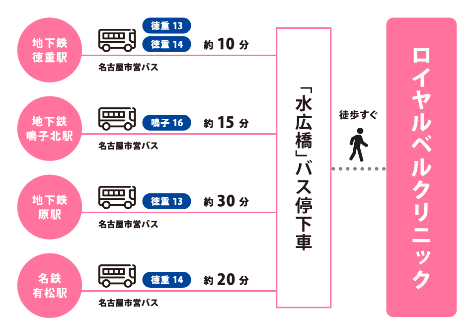 当院へのアクセスがよい地下鉄 徳重駅・鳴子北駅・原駅、名鉄有松駅からバスが運行しております。